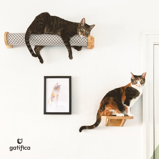 Hemos creado estos packs ahorro para gatos con las combinaciones más prácticas y populares de nuestros productos. Cada parque de pared está pensado para que tus gatos disfruten del salto, el descanso y el juego en vertical, sin renunciar al diseño. Fabricados con madera natural y tejidos agradables al tacto, todos los packs combinan con cualquier estilo de casa.