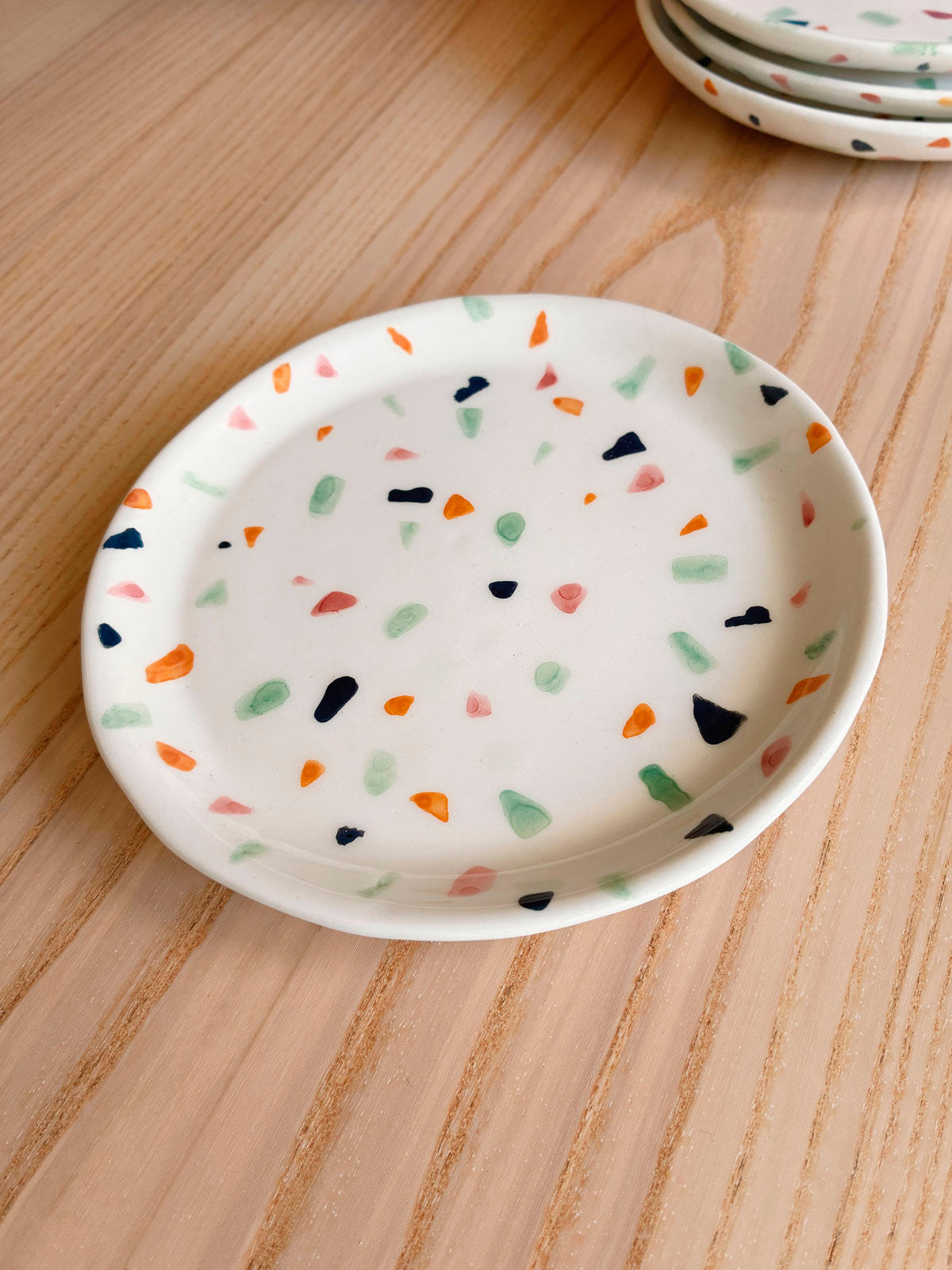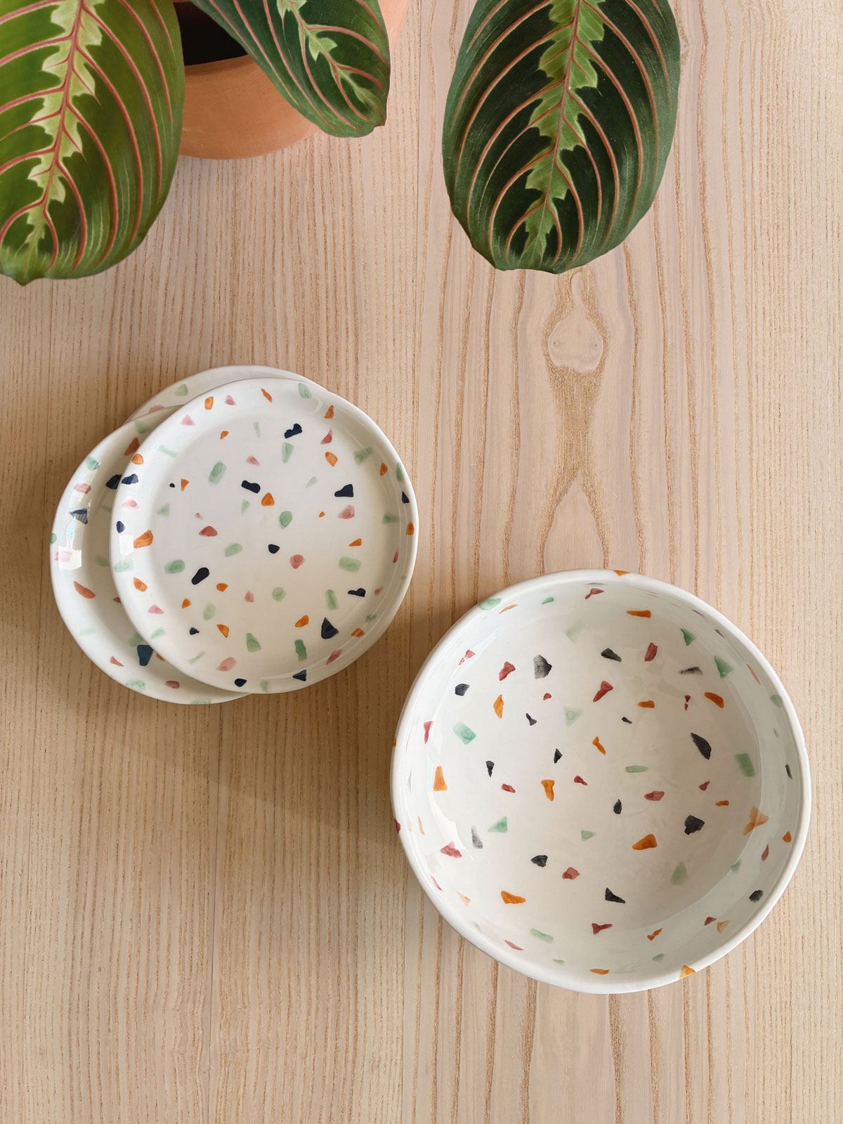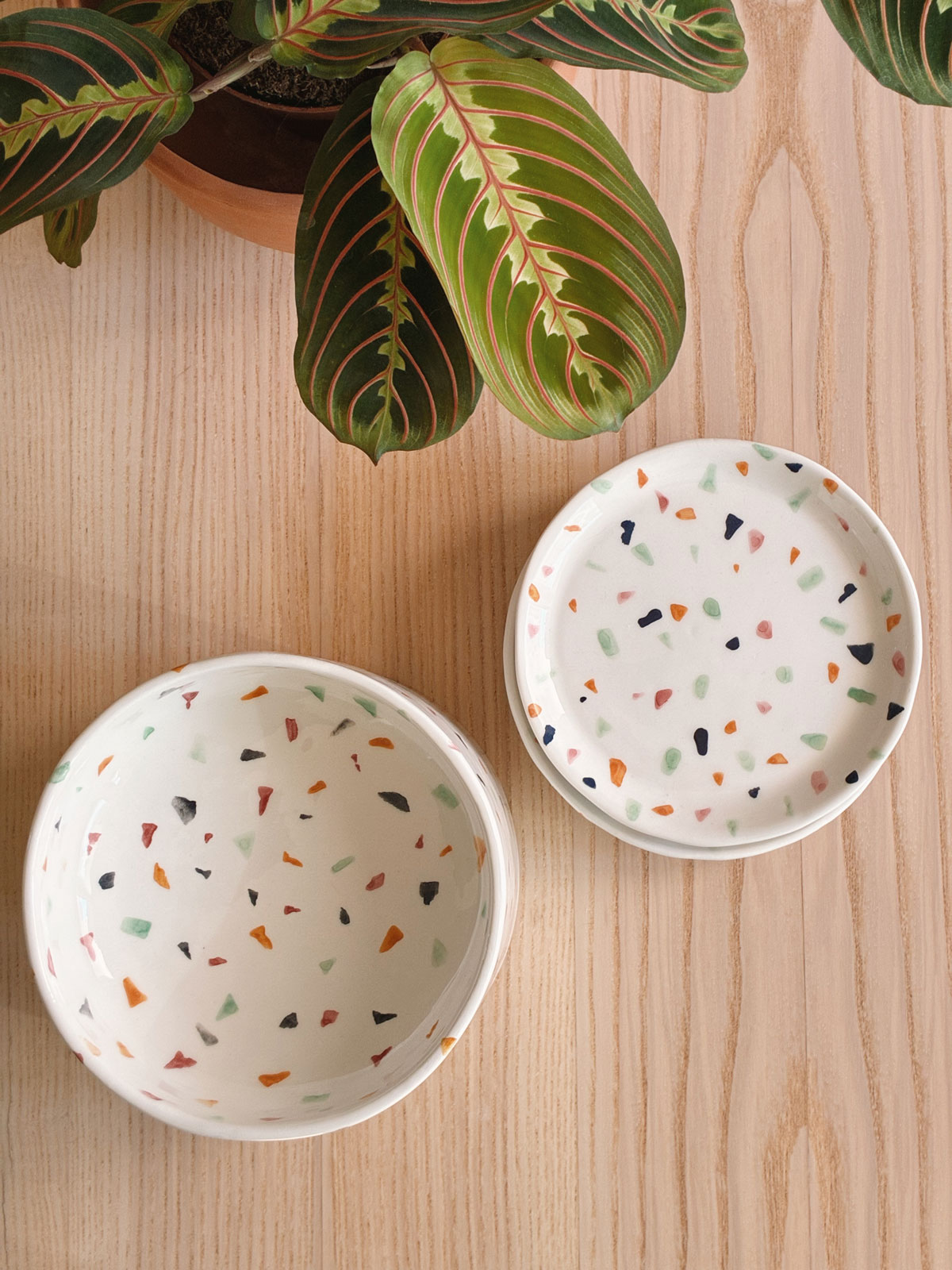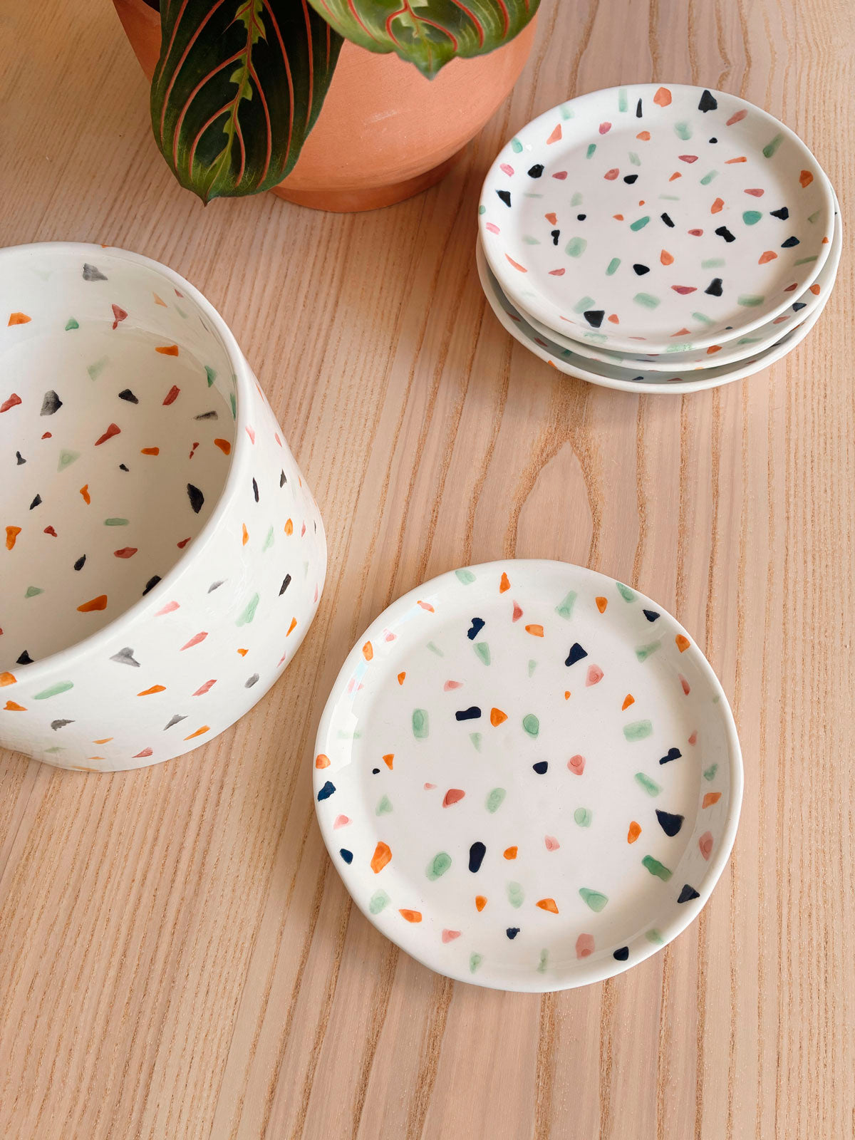 La Vajilla La Isleta está hecha a mano con cerámica de alta calidad y acabados en tonos naturales. Cada conjunto incluye un cuenco elevado y uno o varios platitos planos para comida húmeda, todos decorados a mano con motivos que imitan el terrazo.
